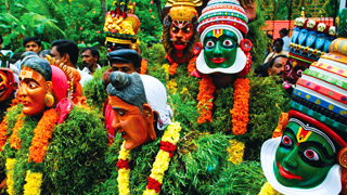The celebration of Kerala's state festival, Onam, is marked by various artistic practices across different regions of the state. In the South Malabar region and central parts of Kerala, Onam is celebrated with the vibrant folk performance known as Kummattikkali. This performance involves a procession of dancers wearing masks and costumes made of green grass or dried leaves. Locals, adorned in these earthy and lively outfits, visit homes and parade through streets, dancing to the rhythm of drum beats. The Kummattikkali held on the second day of Onam in Thrissur city is a famous annual showcase of this tradition. Onam comes in second half of August or first half of the month September. During the Onam festivities, Kummatties roam the village streets, collecting money, rice or jaggery, banana and banana chips which was the old tradition.