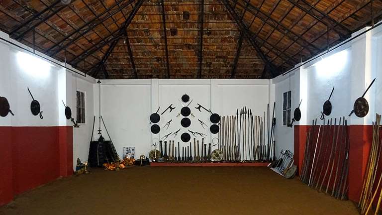 Typically, Kalaripayattu training takes place in a kalari or arena. It is made by digging a rectangular pit (42 feet long and 21 feet broad) in the ground, six feet deep. The mud is compacted to form an even-levelled floor, and a thatched roof raised on two main pillars (21 feet in height and erected on the eastern and western sides of the kalari) covers it entirely. However, the kalaris where full-fledged duels are held are larger. They are usually 64 feet long and 32 feet broad. Soil is used to pat down the surface soil and prevent dust from rising. What is noteworthy is that cow dung was never used to plaster the floor as was customary in nearly every house in Kerala in olden times.