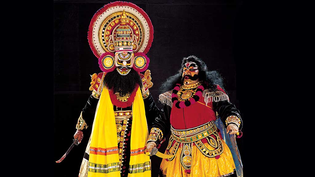 Yakshaganam is an art form performed in South Canara districts of Karnataka and Kasaragod in Kerala. There used to be an ancient form of worship called Bhuta worship practised in these places. Bhuta, which means the past or bygone, refers to the spirit of the ancestors and divine powers. There is a belief that the art form is said to be a manifestation of this Bhuta worship just like Theyyam. As Yakshagana is also influenced by folk dance and Sanskrit drama, it cannot be narrowed down into folk, classical or rural forms since it incorporated elements of all of these. The stories performed in Yakshagana are taken from epics like Ramayana, Mahabharata and Bhagavatham. The word Yakshagana can literally be translated to 'music of celestial beings'. The art form imbibes dance, music and also dialogues. With the accompaniment of background music played using percussion instruments like chenda, maddalam, jagatta or chengila and chakratala or elathalam, the story is narrated by the artists and singers. The performances aren’t always time restrained or fixed to the script but are flexible to improvisations. The dance performance and the dialogues depend on the experience and the skill of the artists. The art form has its own unique stage techniques and the performers sport an elaborate and colourful make-up. The costume consists of a headgear, kavacha, armlets and belts covered with golden foil. The language presented is generally Kannada but is also performed in Malayalam and Tulu languages. It was earlier referred to as Bayatala in some places in Karnataka. Some of the art forms in the neighbouring states like the Therukoothu of Tamil Nadu, Kutiyattam and Chakyarkoothu of Kerala and Veedhinataka of Andhra Pradesh are considered sister art forms of Yakshagana. There's a Yakshagana museum functioning at Manjeshwar Mahakavi Govinda Pai memorial and also a research centre in Government College, Kasaragod. is a ritual folk art form performed in North Kerala since ancient times. It is also known by the name Kaliyattam in some areas. The performance is known as Theyyattam and the elaborate costume is called Theyyakolam. There are over 400 theyyams performed in their own style and music. Some of the prominent ones are Raktha Chamundi, Kari Chamundi, Muchilottu Bhagavathi,Wayanad Kulaven, Gulikan and Pottan. It is a ritualistic performance that combines elements of dance, mime and music. Performances are never conducted on stage but mostly before the village shrines or as ancestor worship in joint-family houses. It honours the beliefs of ancient tribals on worshipping heroes and the spirits of their ancestors. The heavy and elaborate makeup is distinct for each Theyyam. The face painting might take 8 to 10 hours for certain forms as per the traditional rules. The costumes include headgear, ornaments and detailed make-up and the performer dances to the beat of folk instruments like chenda and elathalam, all of which produces a supernatural effect. The duration depends on the significance of the deity being performed and the hierarchy of the shrine and might extend to 12 to 24 hours. Every performance is filled with such energy and grace that the whole premise would seem caught under its spell. The Theyyam season is usually from November to May and begins in Kasaragod and extends to the neighbouring district of Kannur.