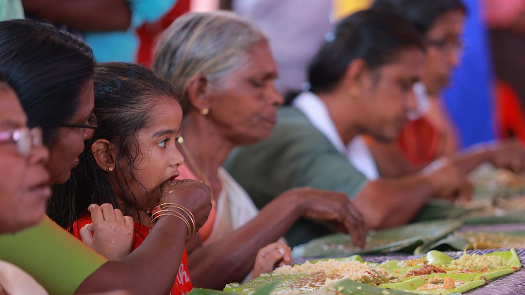 It now begins on the day of Uthradom with the feeding of the elephants at the temple, the ceremony being known as anayoottu. The lavish Uthradasadya follows. That evening is when the valiyavilakku and pallivetta are held. There is also the tradition of welcoming Mahabali on the day of Thiruvonam. This is followed by a pakalpooram by seven elephants in honour of Sribali with instruments such as the special nadaswaram, thakkil and the musical ensemble of Panchari Melam. The Thiruvonam special sadya begins after 10am. The Thiruvonam sadya comprises parippu, poppadom, a pinch of salt, sambar, erissery, kalan, avial, olan, pachadi, kichadi, pickles, ginger curry and palada pradhaman. This is finished with a serving of rasam. The injithairu (ginger in curd), considered the equivalent of 108 curries, is also served at the Thrikkakara Onam Sadya. People arrive by the dozen for the sadya. Moreover, a sadya is held on the Thiruvonam day of every month. On this day, either sambar, kalan, erissery, injithairu and chena (elephant foot yam) curry or potato curry, string beans thoran, pal payasam and the like are served at the temple.