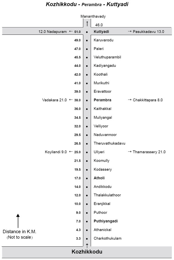 Kozhikkode 38.0 kms. Kuttyadi route. Vadakara 21.0 kms.